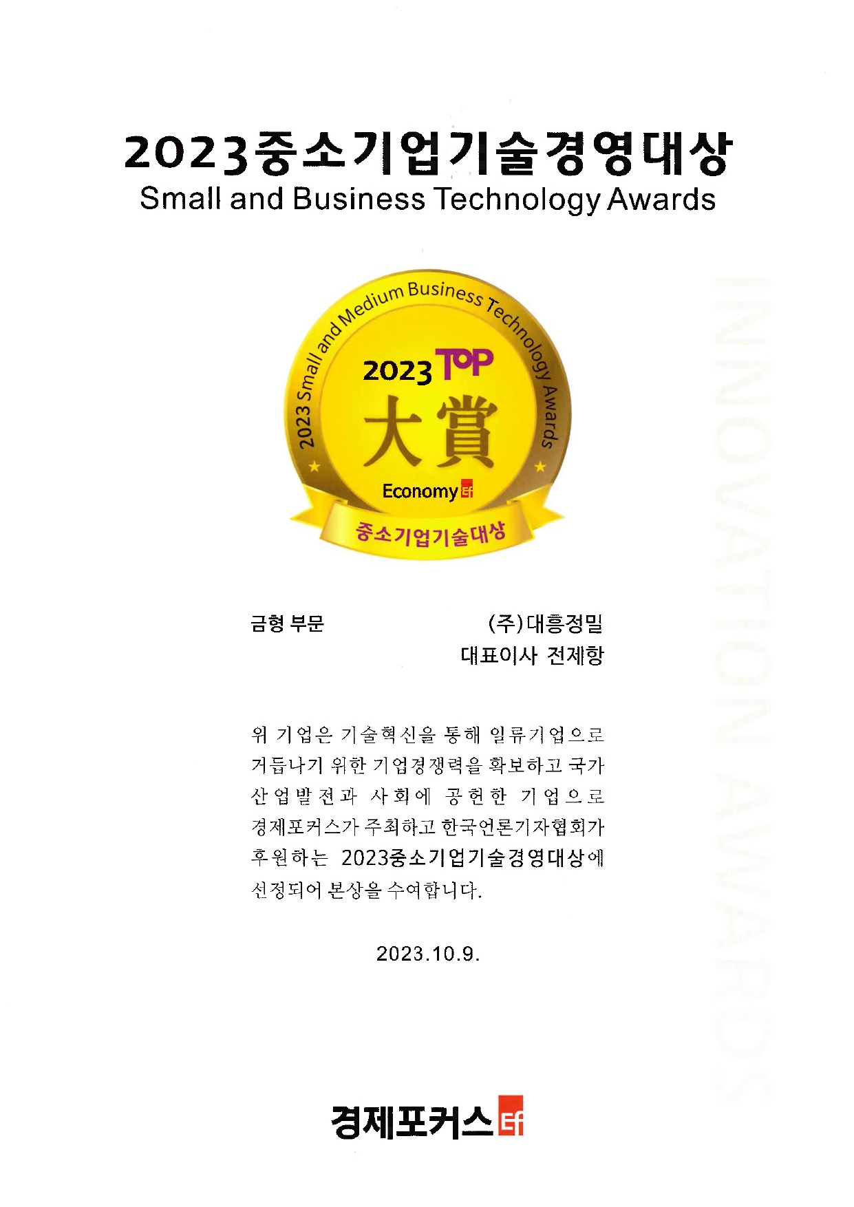 (ÁÖ)´ëÈïÁ¤¹ÐÀÌ °æÁ¦Æ÷Ä¿½º°¡ ÁÖÃÖÇϰí Çѱ¹¾ð·Ð±âÀÚÇùȸ°¡ ÈÄ¿øÇÏ´Â <2023 Áß¼Ò±â¾÷±â¼ú°æ¿µ´ë»ó>¿¡ ¼±Á¤µÇ¾ú½À´Ï´Ù.